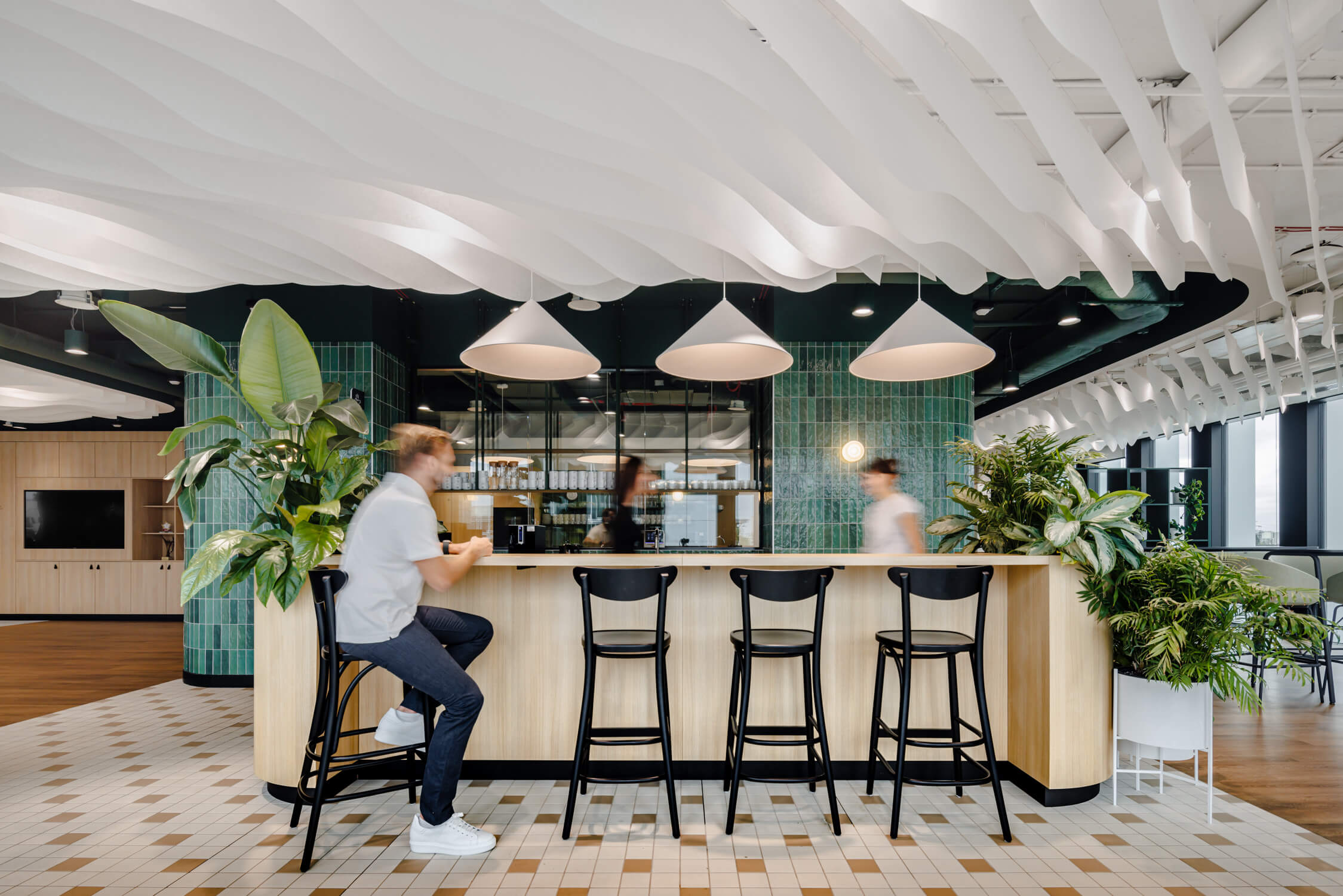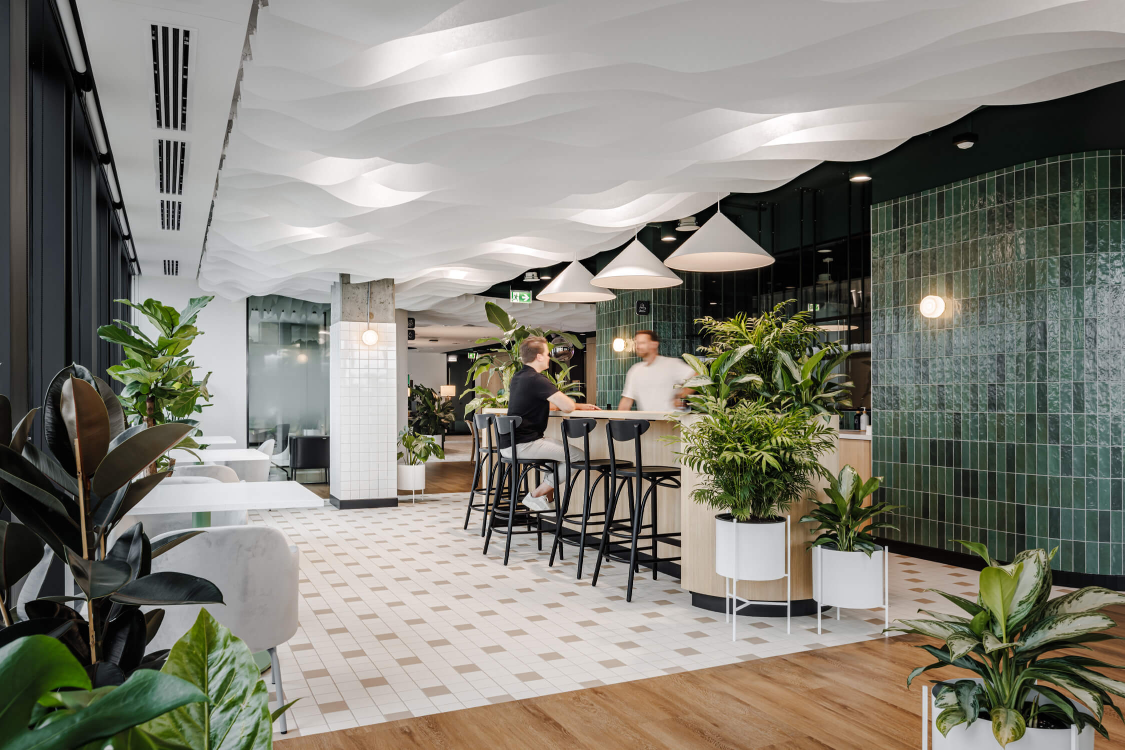 Chcąc w pełni wykorzystać rozmiary biura, w projekcie zastosowaliśmy szereg kreatywnych i różnorodnych rozwiązań. Przestrzeń wzbogaciły wiszące donice, które stworzyły spójne kompozycje, a w stoły w kuchniach wkomponowaliśmy małe drzewa. Nie zabrakło również praktycznych i estetycznych lockerów z nadstawkami i funkcją przechowywania oraz wysokich prostopadłościennych donic, stanowiących przegrody między biurkami. Łącznie stworzyliśmy około 200 lockerów z nadstawkami i 134 prostopadłościenne donice. Te rozwiązania wprowadziły do wnętrza zielone akcenty widoczne z różnych miejsc w biurze. Wykonaliśmy również specjalną roślinną kompozycję do efektownej donicy o falistym wykończeniu, która znalazła się na najbardziej reprezentatywnym piętrze biura, zdobiąc recepcję zarządu.
