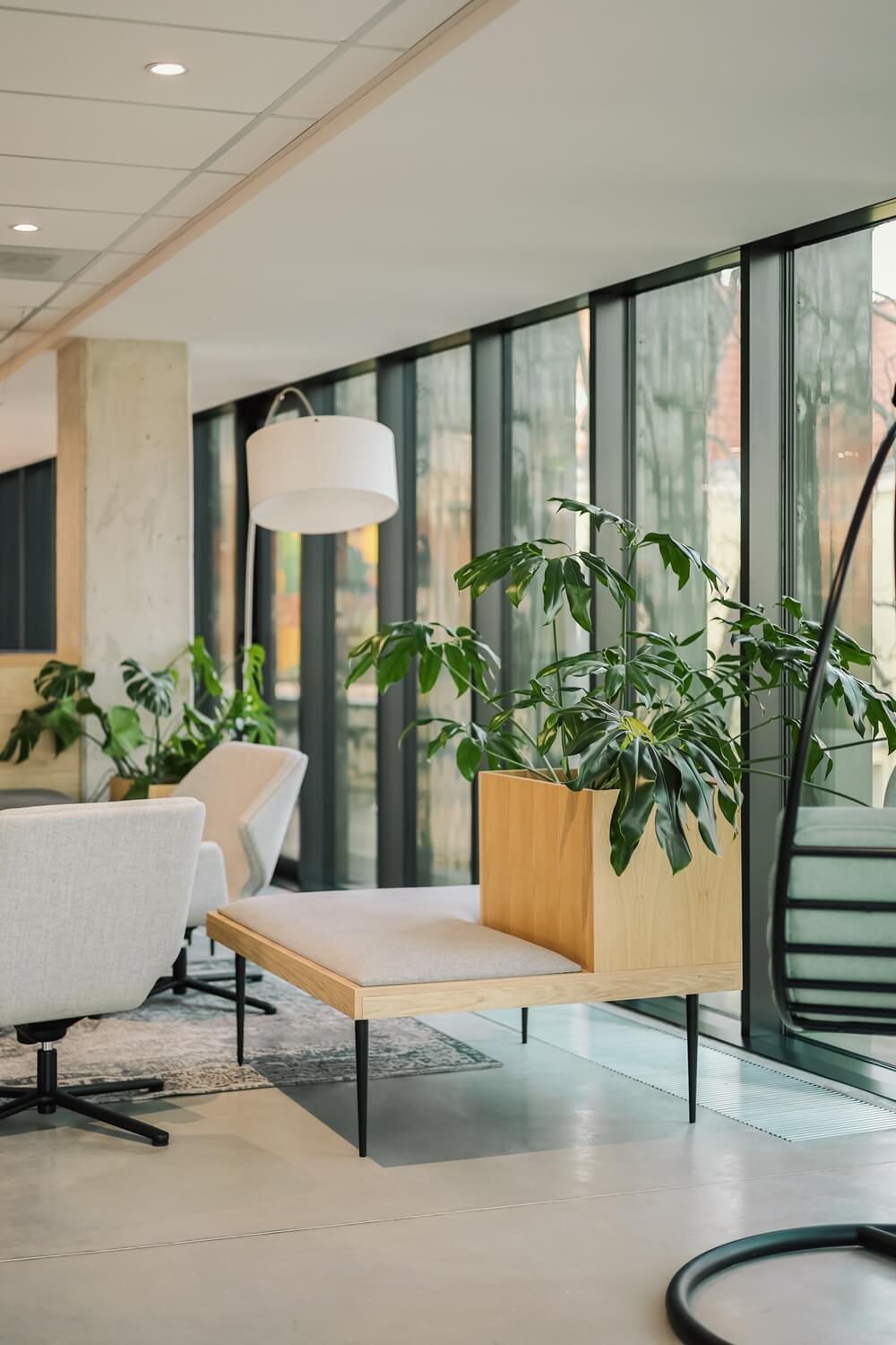 Głównym założeniem projektu było stworzenie spójnej i harmonijnej koncepcji aranżacji zieleni, utrzymującej powtarzalność elementów na każdym piętrze budynku. W tym celu zadbaliśmy o przemyślany dobór gatunków roślin i donic, stawiając na minimalistyczne modele wykonane betonu i drewna w neutralnych kolorach. Wyzwaniem było również wykonanie nasadzeń w różnorodnych lokalizacjach - zabudowach meblowych, siedziskach, wolnostojących kwietnikach - przy jednoczesnym zachowaniu funkcjonalności przestrzeni. Szczególną uwagę poświęciliśmy strefom open space, gdzie aranżacja roślin musiała być wyjątkowo przemyślana, by nie utrudniała codziennego użytkowania przestrzeni, a jednocześnie zapewniała przyjemny, codzienny kontakt z naturą.
