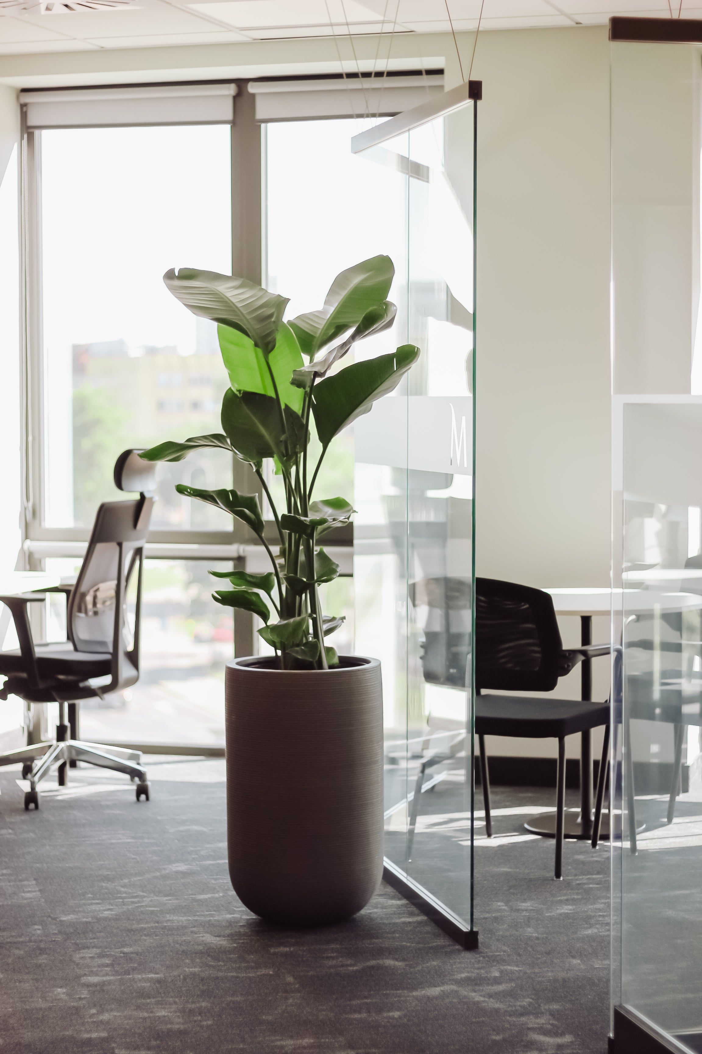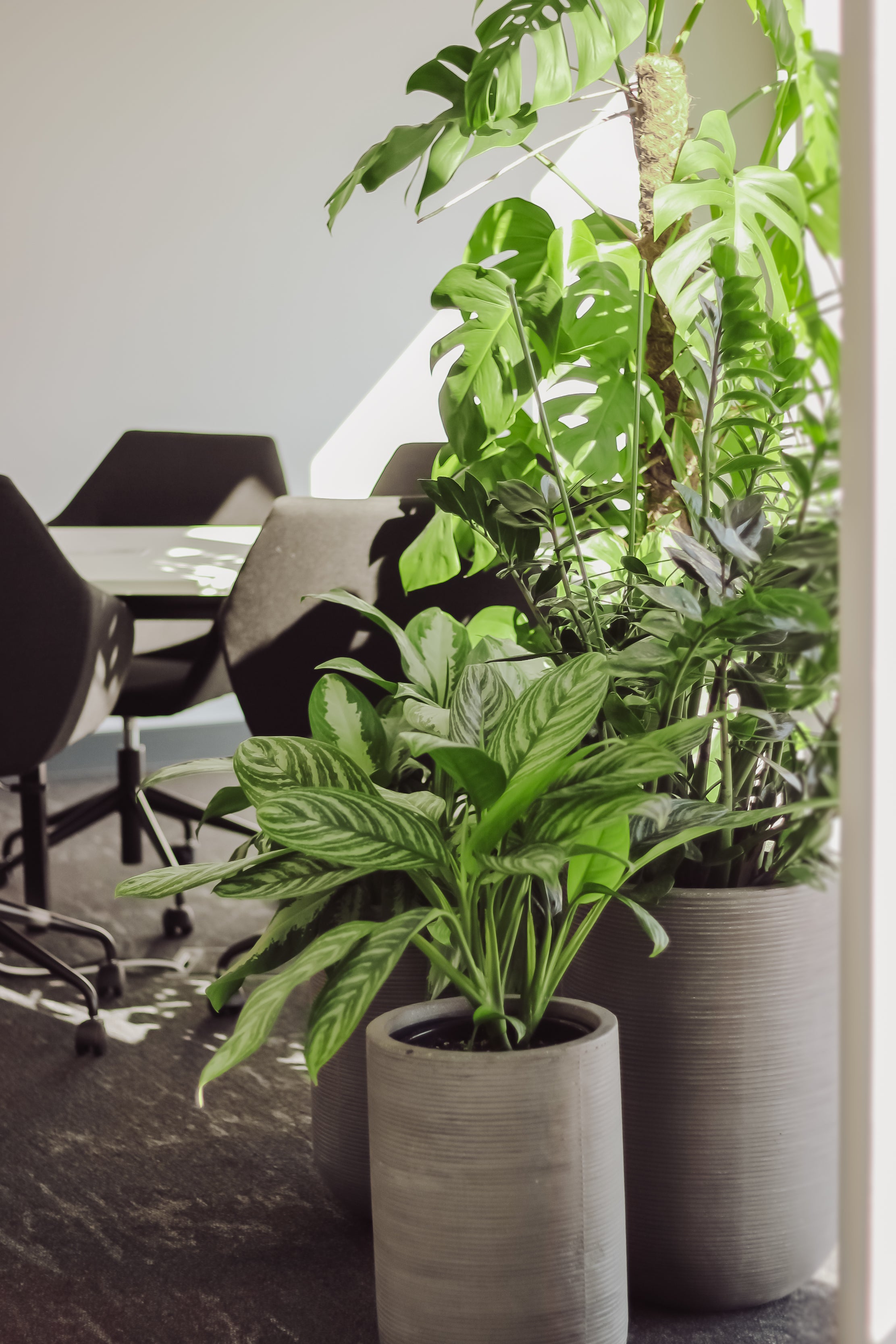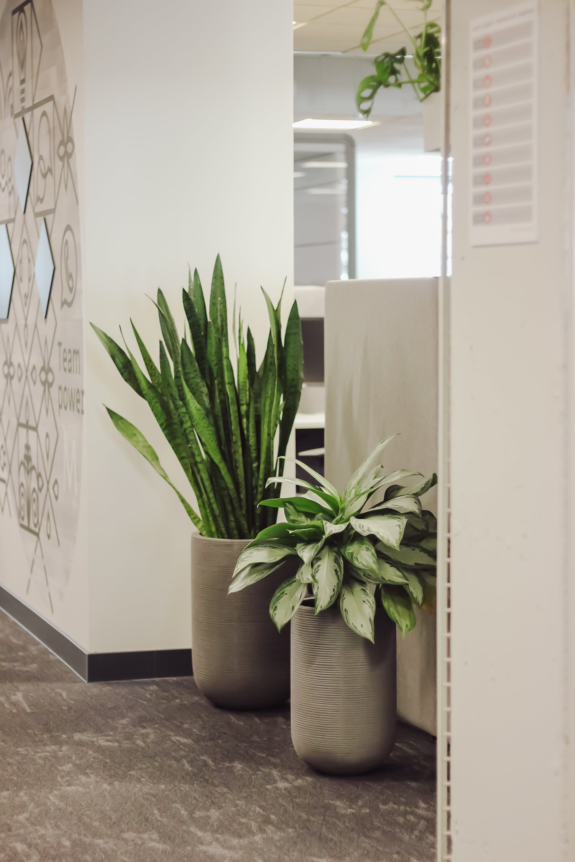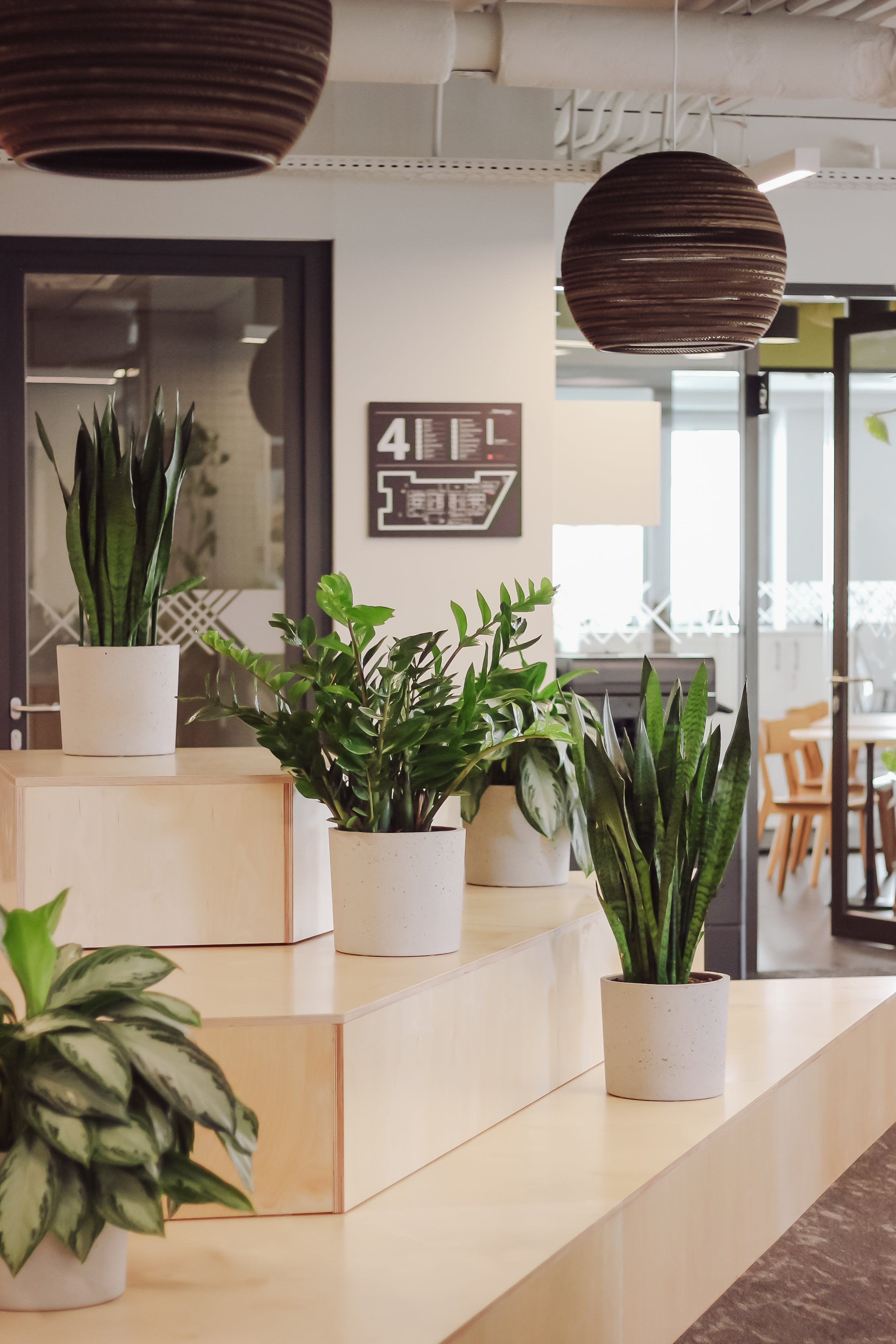 Projekt obejmował dwie kondygnacje o zróżnicowanych warunkach środowiskowych, co stanowiło wyzwanie pod względem aranżacyjnym. Do części biura o ekspozycji na północny zachód wprowadziliśmy gatunki bardziej odporne na ograniczony dostęp do światła, natomiast w drugiej części, znajdującej się od strony południowo-wschodniej, umieściliśmy gatunki wytrzymałe na intensywne nasłonecznienie.