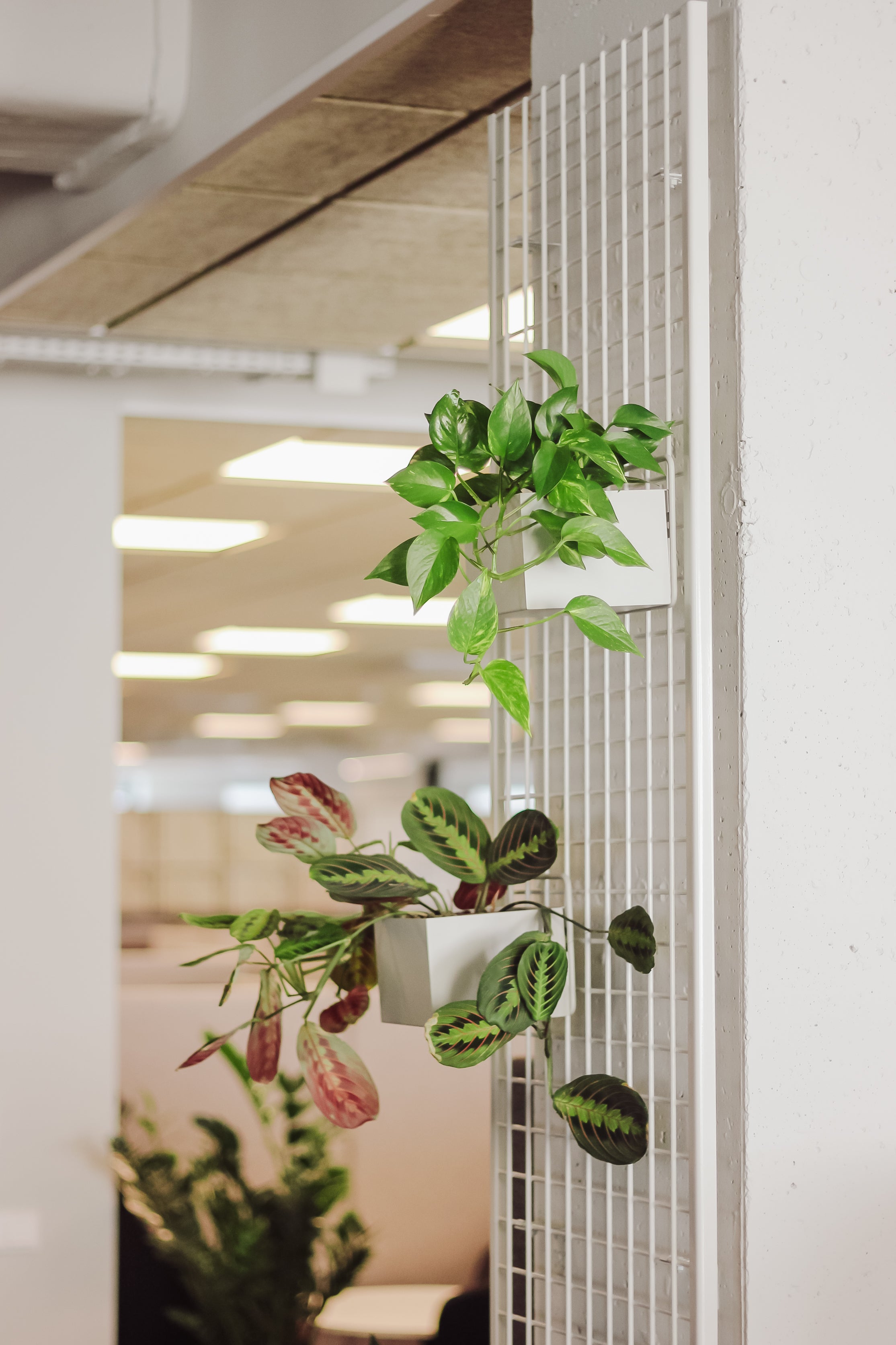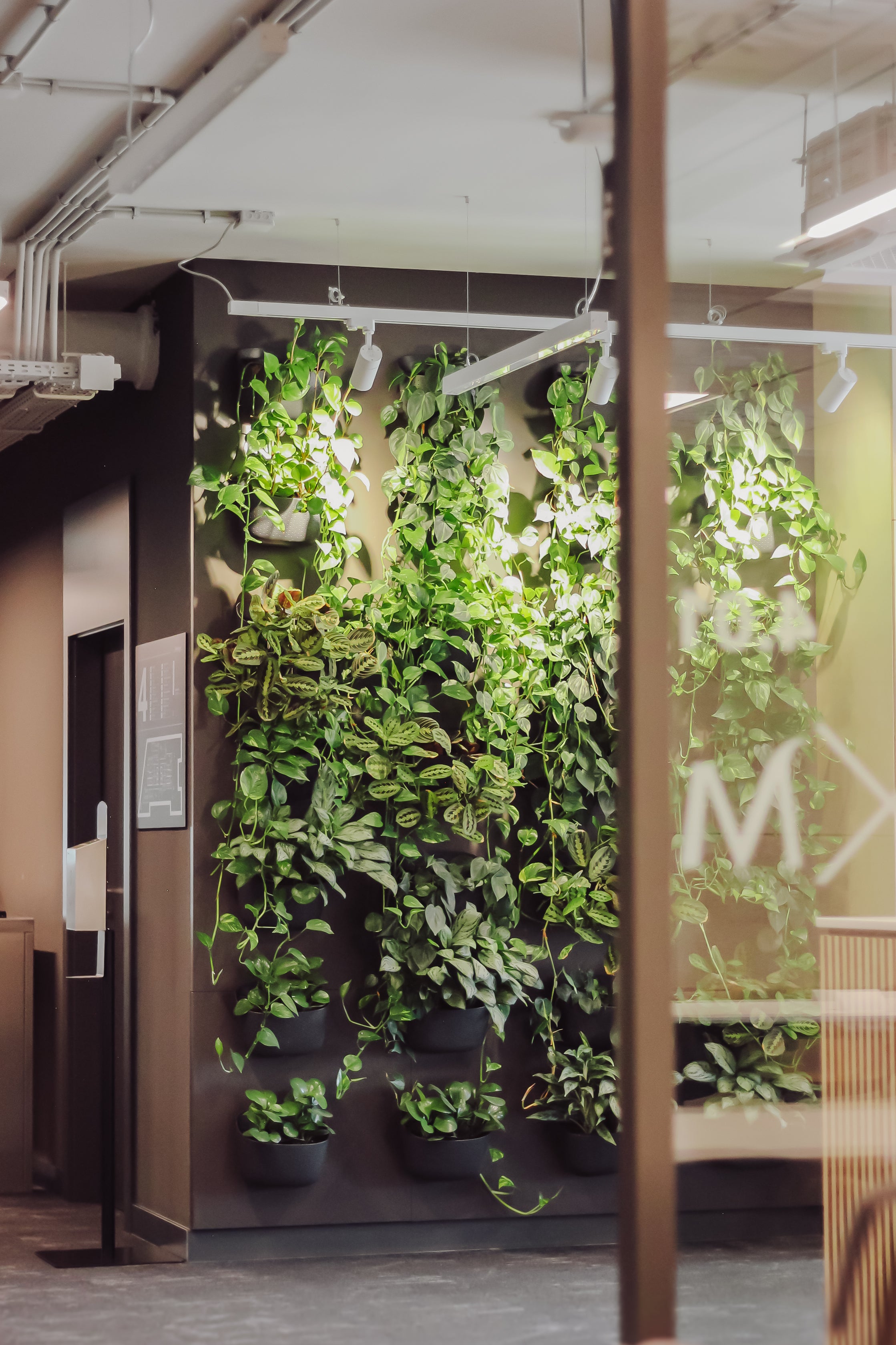 Następnie przystąpiliśmy do kluczowego aspektu realizacji - instalacji zielonej ściany bez automatycznego systemu nawadniania, co było priorytetem dla naszego klienta. W tym celu wykorzystaliśmy system naściennych doniczek WallyGrow, wyprodukowanych w 100% z recyklingowego plastiku. System ten pozwolił na stworzenie bujnych ogrodów wertykalnych przy niskim nakładzie środków i minimalnej ingerencji w istniejące instalacje w pomieszczeniach biurowych.