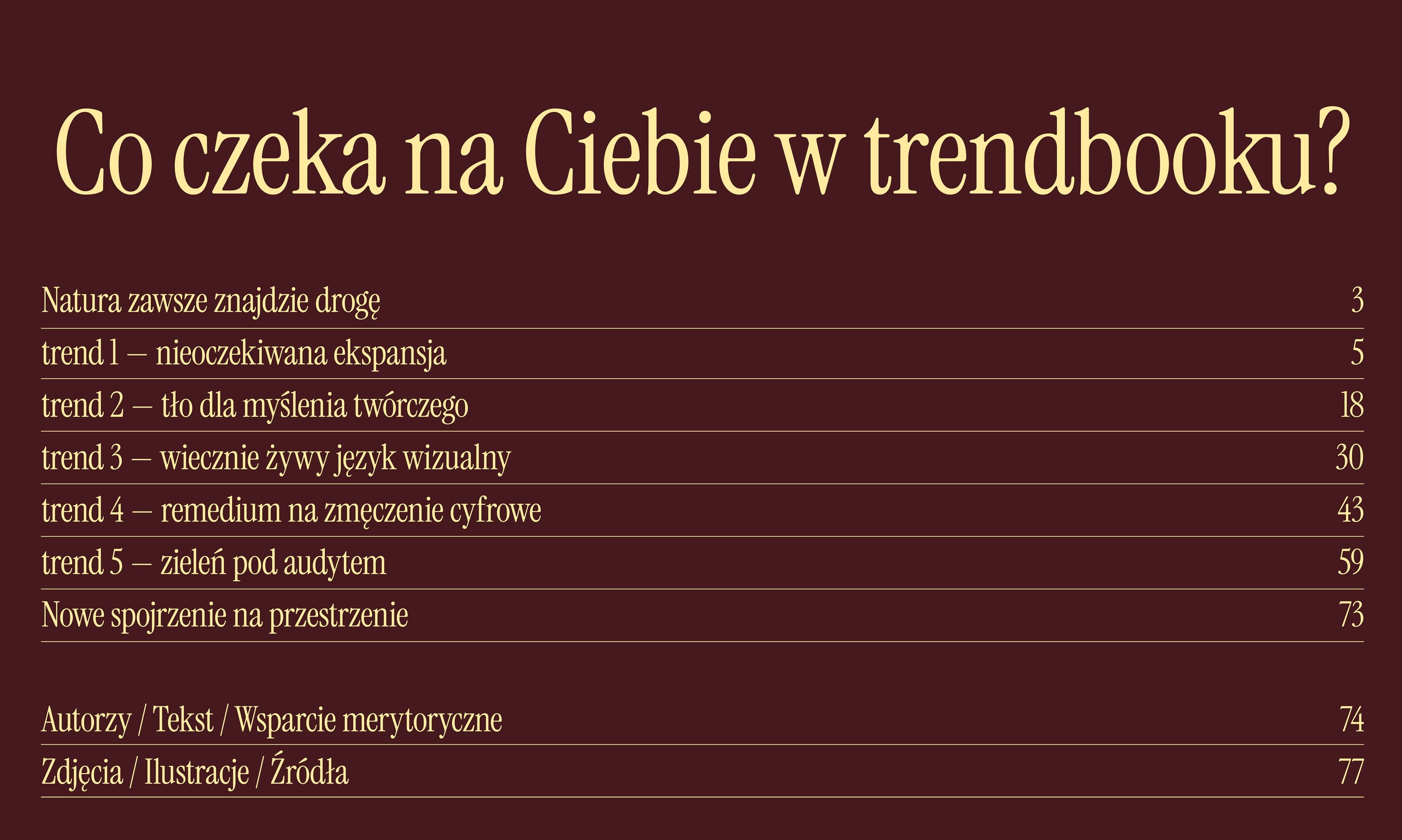 Roślinny Trendbook to projekt, który zaczęliśmy rozwijać w 2025 roku. Kierujemy go do projektantów, architektów, office managerów, kierowników projektów i wszystkich, którzy wierzą, że nasze otoczenie ma wpływ na to, jak czujemy się na co dzień. Dzieląc się tą zupełnie darmową publikacją, chcemy zainspirować Cię do refleksji nad tym, w jaki sposób możemy wykorzystać naturę, by tworzyć miejsca wspierające dobrostan psychofizyczny człowieka. Poniżej dowiesz się, co czeka na Ciebie w Roślinnym Trendbooku 2026.